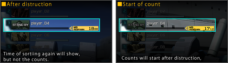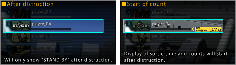 - We have modified the display to show the re-launch time at the timing when the count actually starts after an allied MS is destroyed and the animation has been completed. The timing of displaying the number of seconds remaining before launching again is now correct.