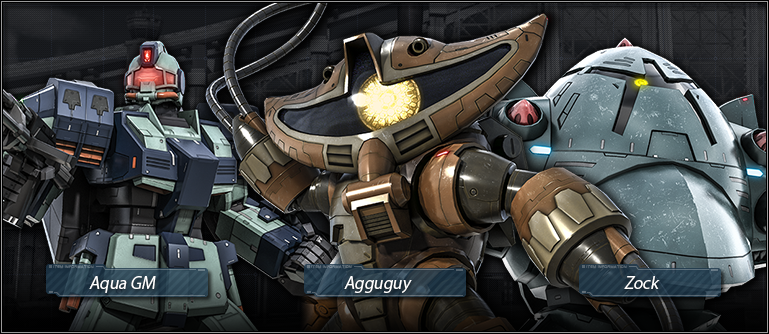 ・★★ Zock LV4 (Support Unit, Ground only, Cost 600) ・★ Aqua GM LV4 (General Unit, Ground only, Cost 450) ・★ Agguguy LV4 (Raid Unit, Ground only, Cost 400)
