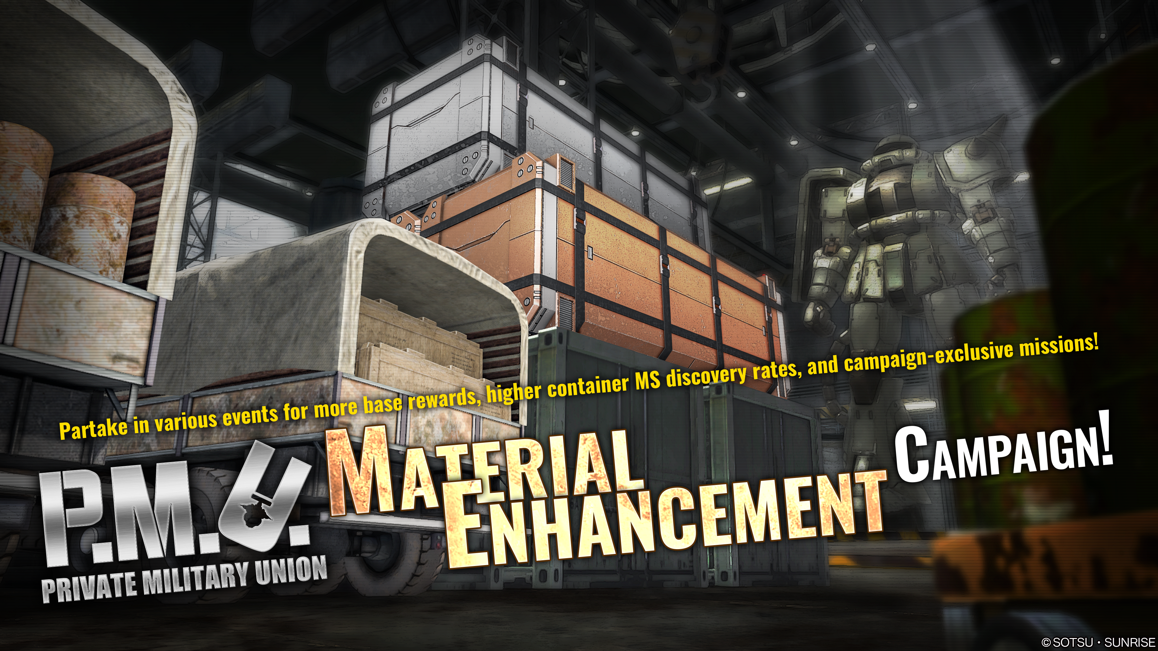 During the period, we will hold the “P.M.U. Material Enhancement Campaign” in which you can obtain a large amount of various rewards such as increased basic rewards, a large boost in the probability of MS being found in containers, and also the limited time missions to be issued!
