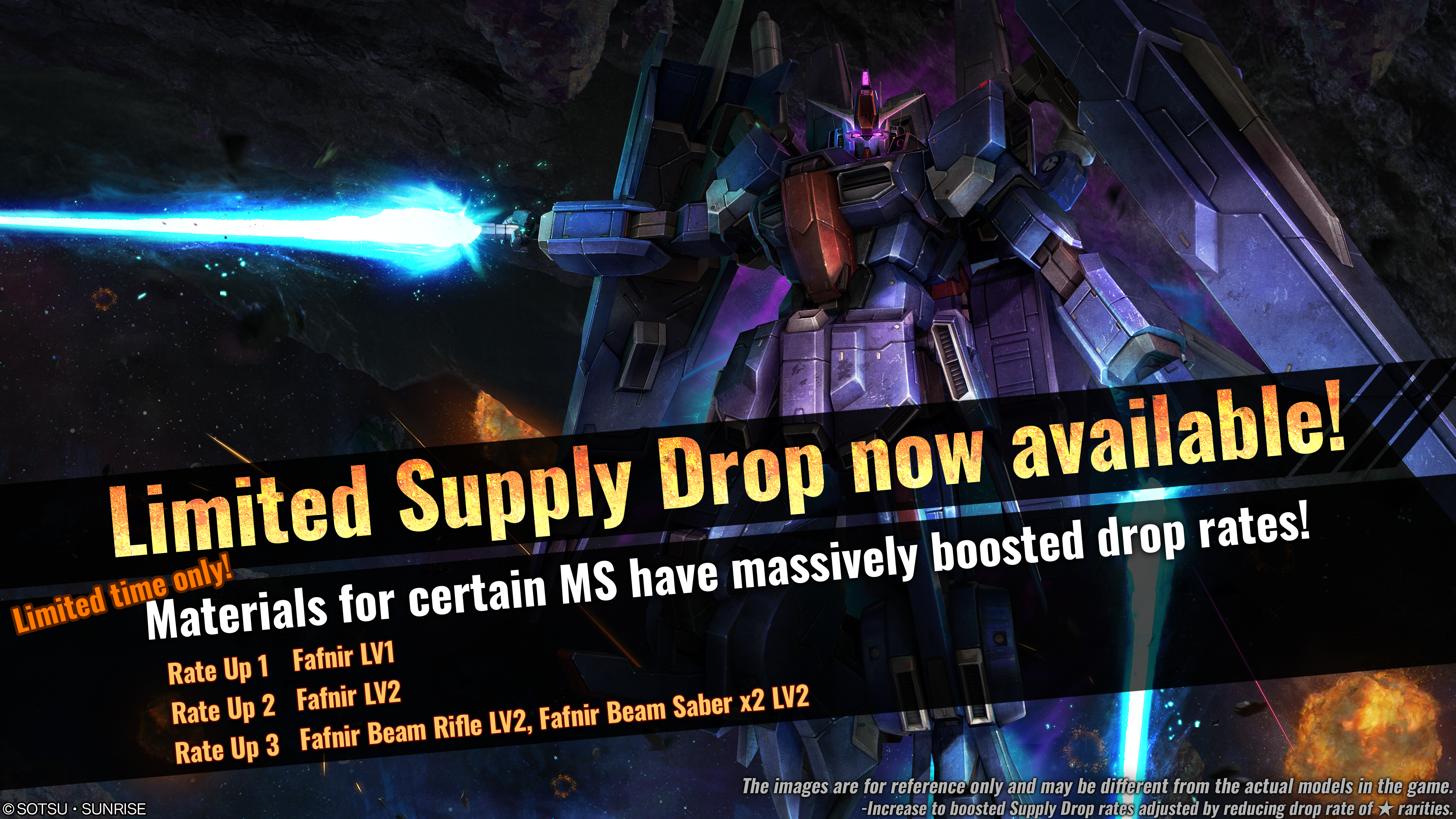 Differing from the standard Supply Drop, only the specified items in the Limited Supply Drop will be boosted. - ※Drop rate increases of the Limited Supply Drop will affect the unit of each LV and also the unit’s main weapon differently.