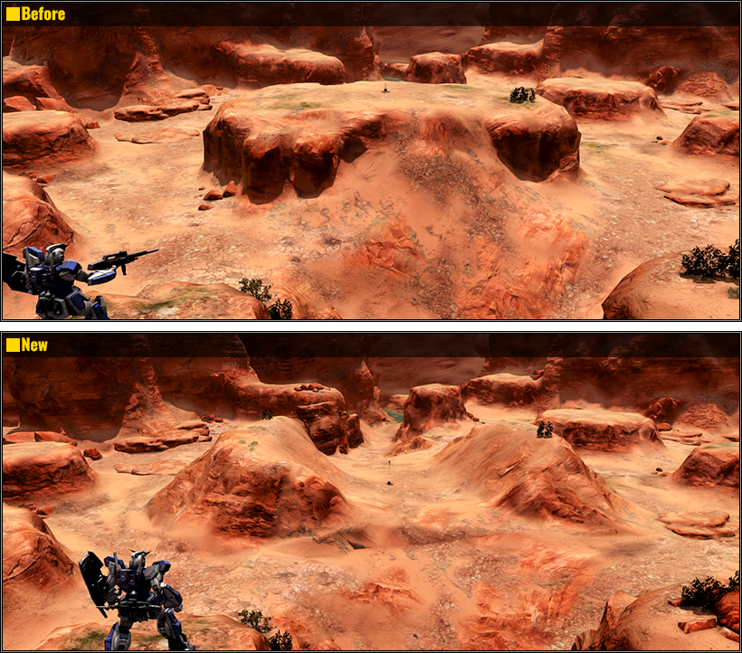 - ⇒ This map tended to result in a stalemate due to long-range firefights in the central area, so we have modified the shape of the central high ground to allow players to advance while taking cover.