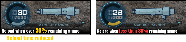- ・When reloading with 30% ammo remaining for ranged ballistic, beam (round counting-based), and other round counting-based weapons, reload time is reduced by 30%.