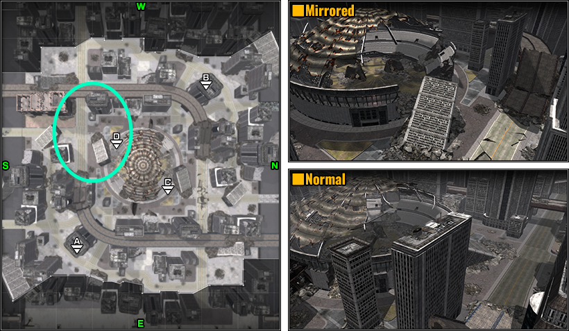 The images below of the normal and mirrored maps both show a view overlooking the central dome from the southwest.