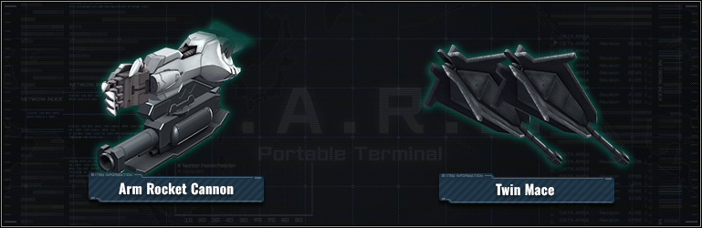 - **Main weapons “Twin Mace” and “Arm Rocket Cannon” need to be obtain in the game separately.