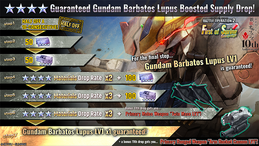 Starting from [PST] 03/04/2026 / [CET] 03/05/2026, Gundam Barbatos Lupus LV1 guaranteed STEP UP Supply Drop will begin.
