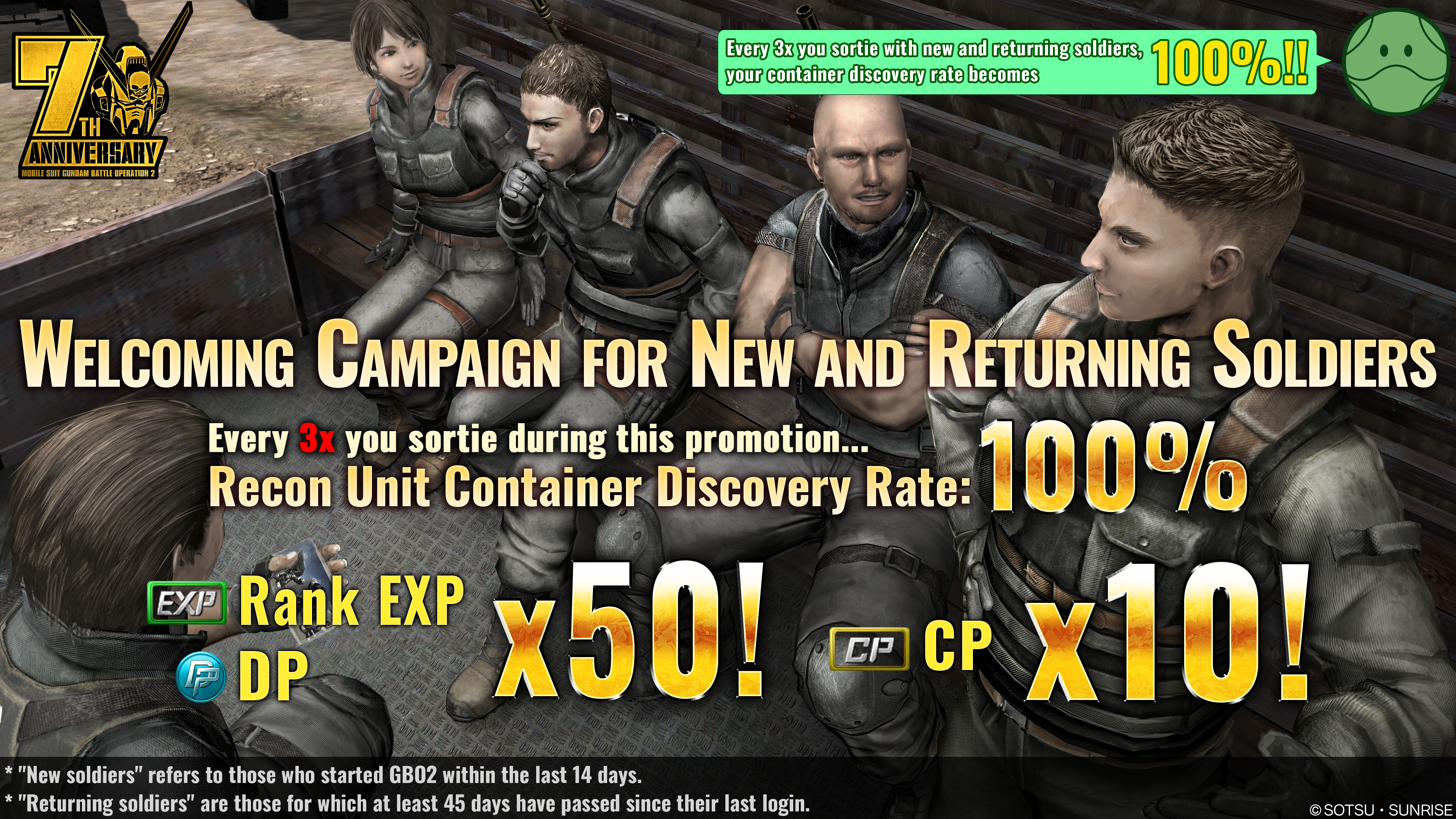 During the period, new soldiers who joined GBO2 within the last 14 days or returning soldiers whose last login was over 45 days ago will receive boosted rewards — EXP and DP will be multiplied by 50, and CP will be increased by 10!