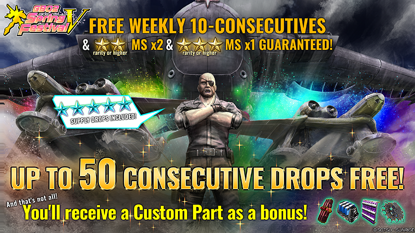 (Up to 50 drops + ★★ or higher rarity MS x10 + ★★★ or higher rarity MS x5) - Additionally, ONE random custom part from 4 is also drawn for sure!