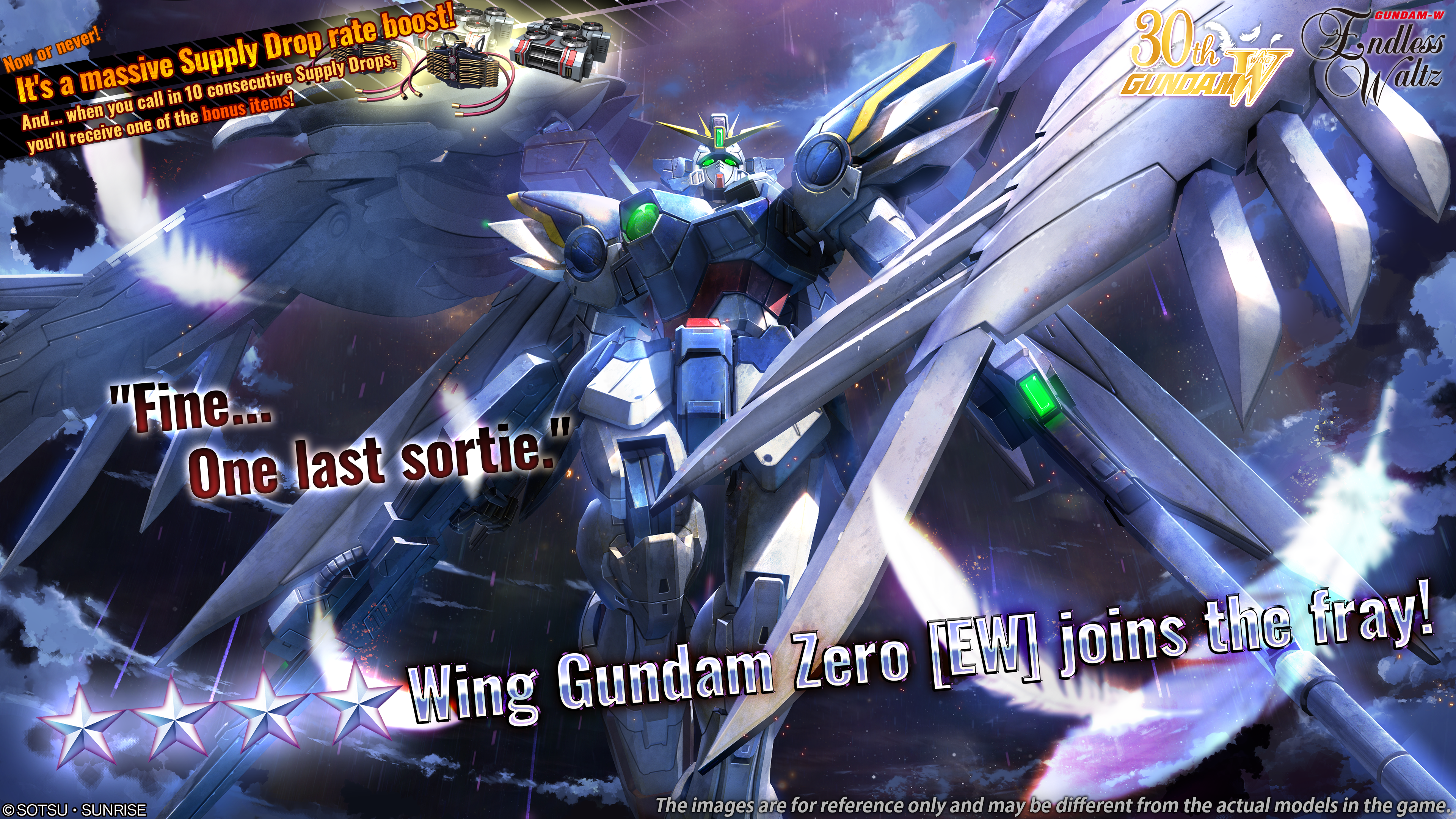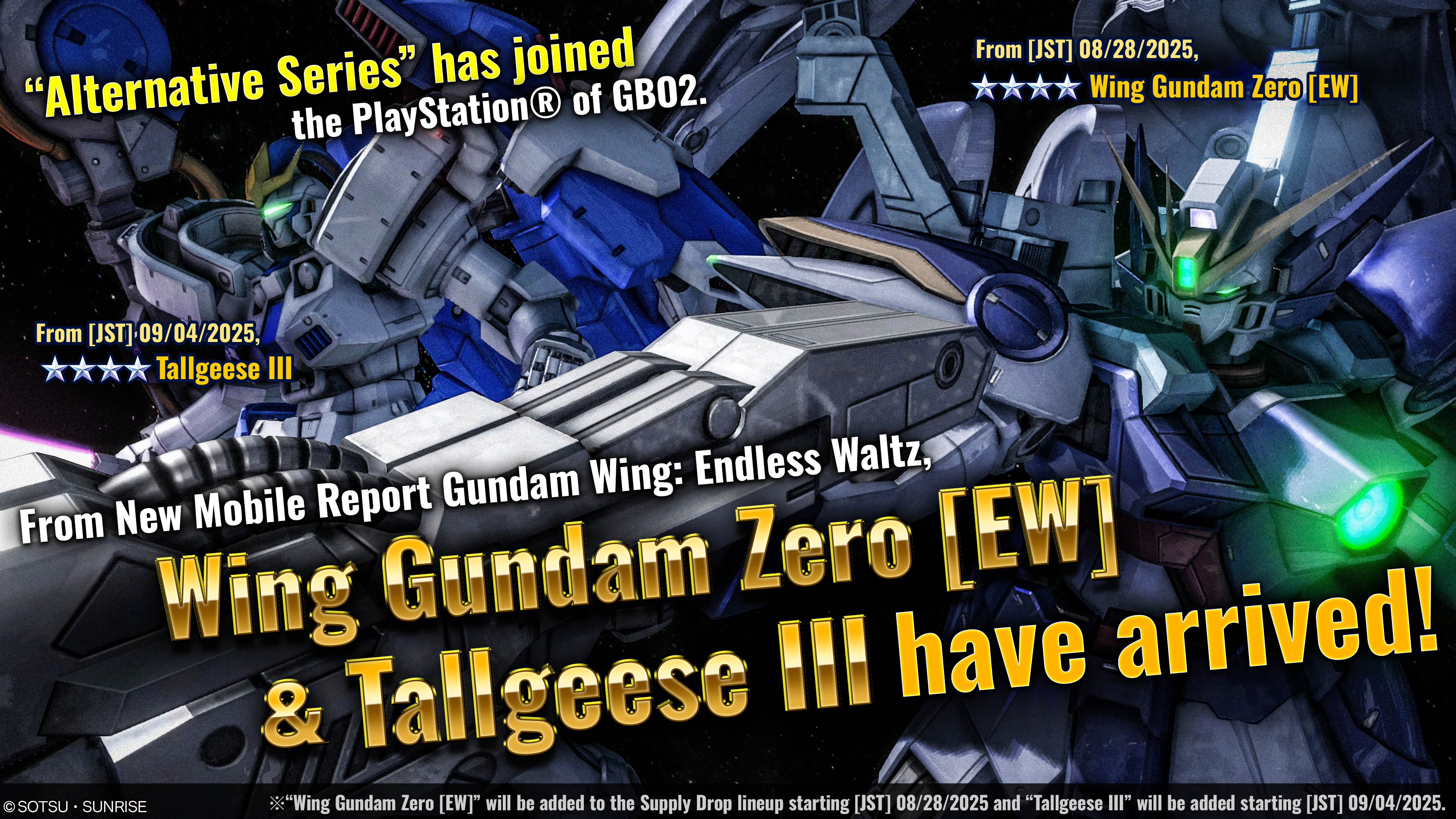 - ※“Wing Gundam Zero [EW]” will be added to the Supply Drop lineup starting [JST] 08/28/2025 and “Tallgeese III” will be added starting [JST] 09/04/2025.