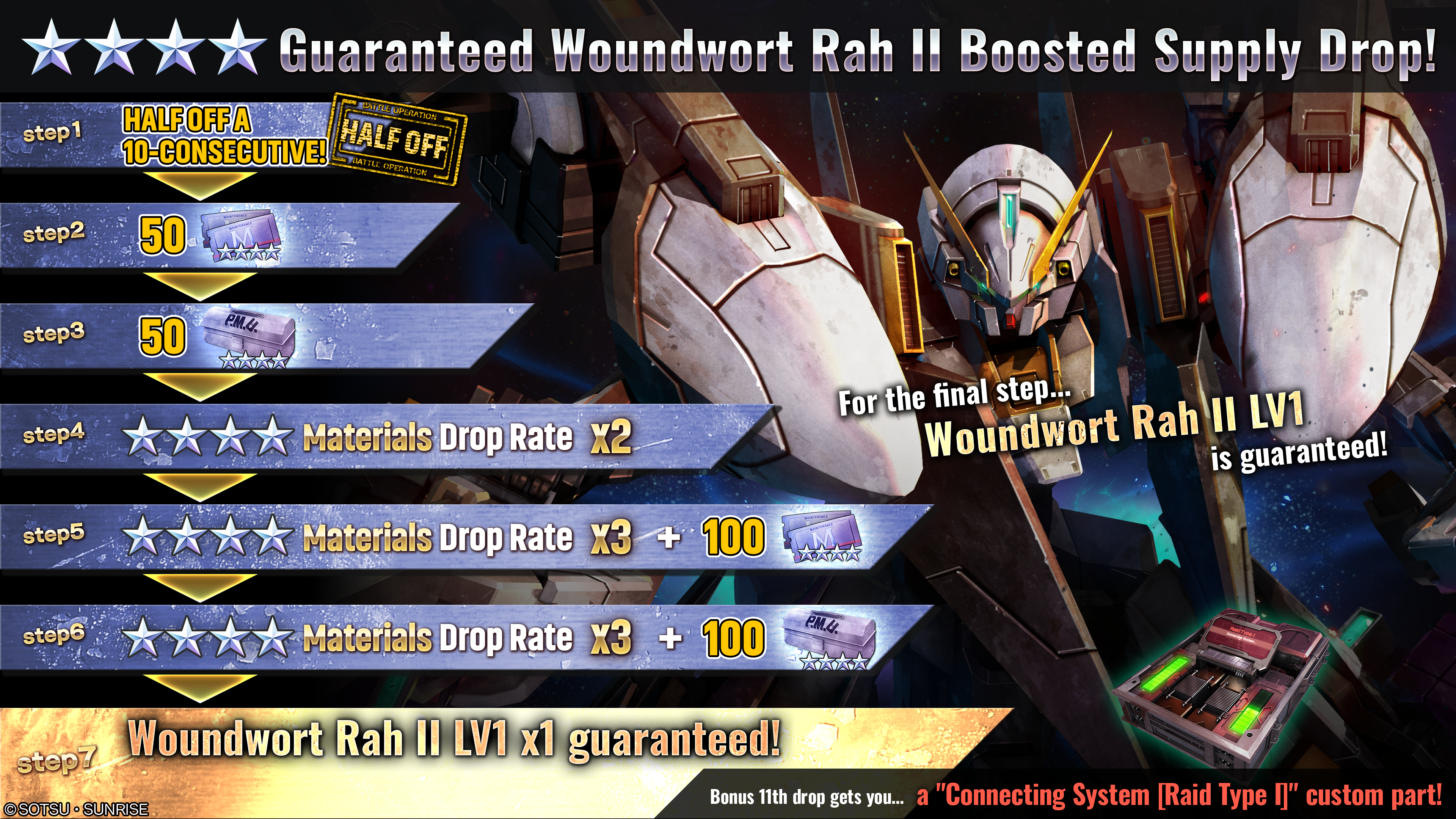 - ・STEP6 (30 Tokens): ★★★★ Materials Drop Rate x3! + 100 ★★★★ Modification kits as a bonus!