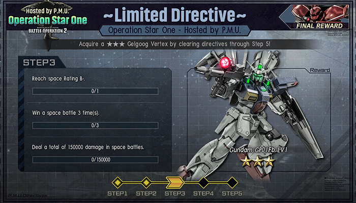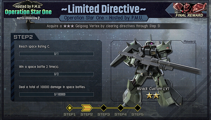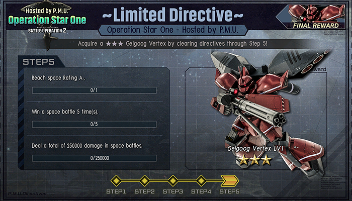 - The content of new directives are all specific to space battles. If you complete each directive, you will be awarded with 1 MS qualified for space use. If you complete all the limited-time directives…you can receive the new MS unit, Gelgoog Vertex! (Scheduled for release on June 6, 2021 JST)