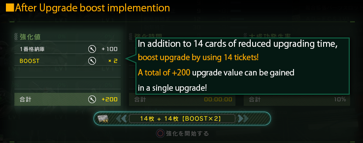 - Up until now, up to 14 “Mechanics Tickets” could be used at the Hanger at one time, but this “Enhancement boost” will allow you to increase the enhancement value obtained at one time by adding more tickets to the number of tickets used when enhancing the MS.