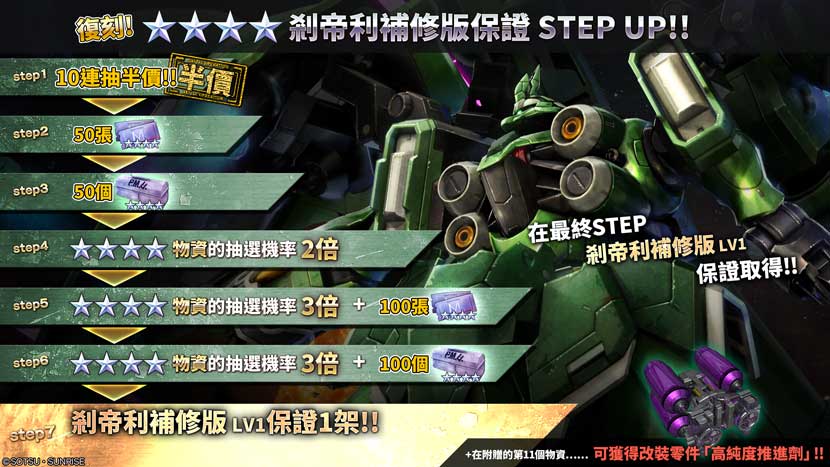 - ・STEP6(代幣30枚):★★★★物資的抽選機率3倍!+ 保證獲得改裝套件[★★★★]100個!