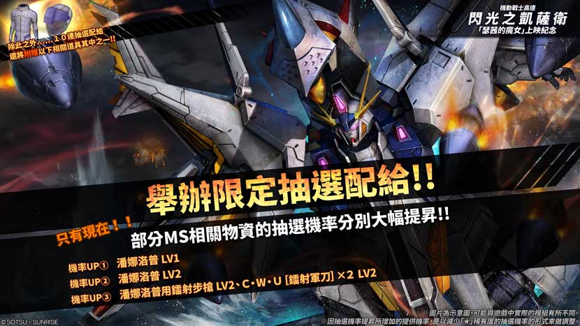 - 限定抽選配給將會針對目標機體各LV,主武裝等提高各自的抽選機率。