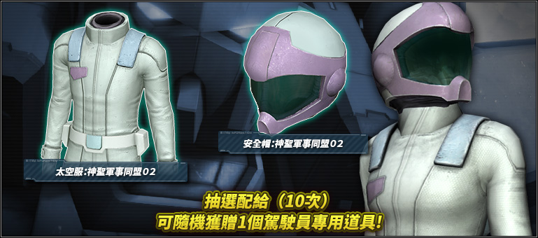 - ※期間內只要進行抽選配給(10次)就會自動進行第11次的抽選配給,就可隨機獲得駕駛員專用道具1個。