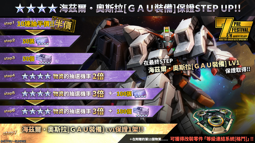 - ・STEP7(代幣30枚):「海茲爾・奧斯拉[GAU裝備] LV1」保證1架!!
