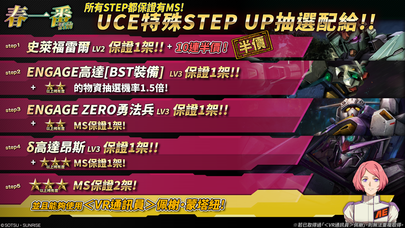 - ENGAGE高達[BST裝備] LV3 保證1架!+★★以上的物資抽選機率1.5倍!