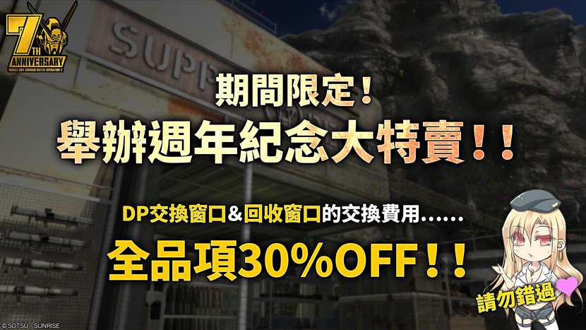 - 所有可在物資配給局的DP交換窗口&回收窗口交換的物資期間限定全品項30%OFF!