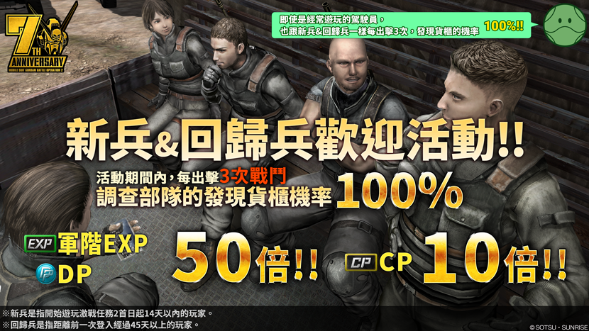 經常遊玩的駕駛員們,只要與新兵&回歸兵一同出擊 3 次戰鬥,調查部隊的貨櫃發現率也會提升至100%! - 詳細內容,請參閱這裡。