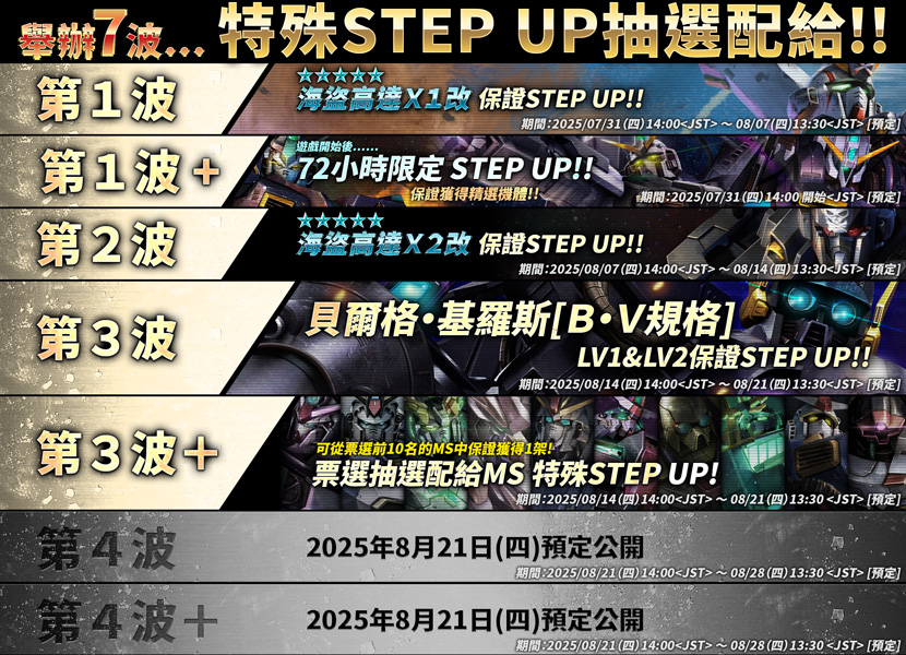 - 第3波+:可隨機獲得票選前10名MS的STEP UP!
