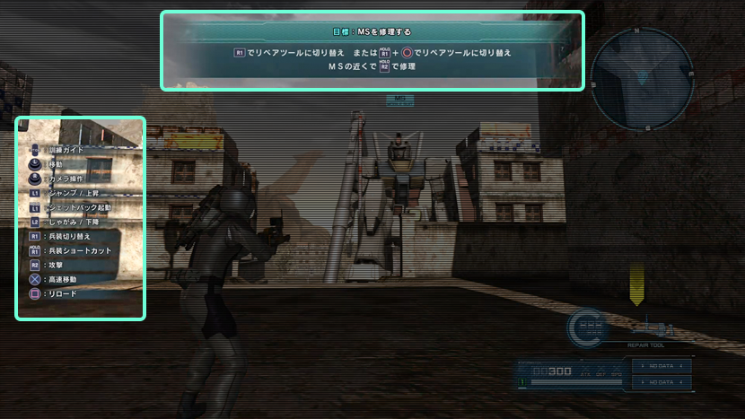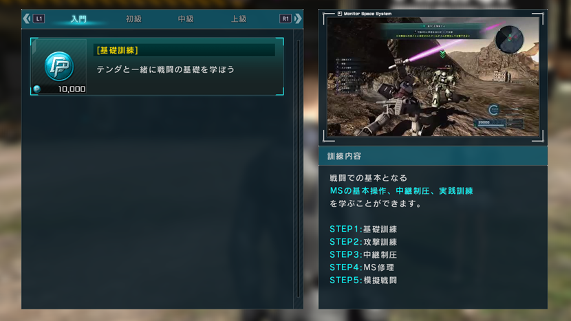 - ⇒ 以往的教學是以各STEP逐步學習單一操作的形式,但這次修改後,玩家能以實戰流程的方式,從地圖移動方法、擊破敵方 MS 到取得勝利,一連串地進行學習。