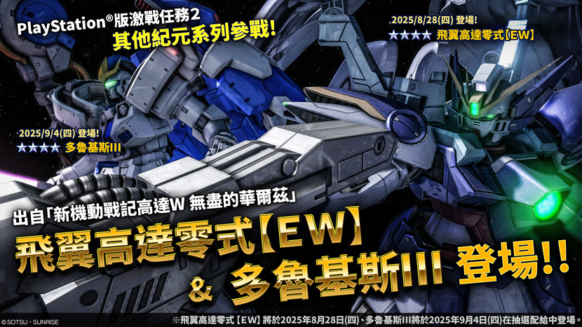 - ※「飛翼高達零式【EW】」將於2025年8月28日(週四),「多魯基斯Ⅲ」將於2025年9月4日(週四)在抽選配給中登場。