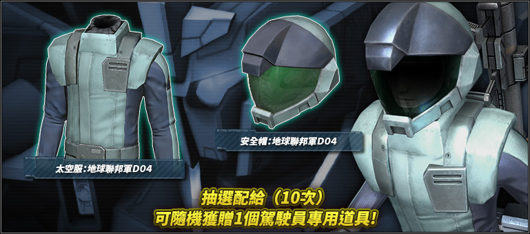 - ※期間內只要進行抽選配給(10次)就會自動進行第11次的抽選配給,就可隨機獲得駕駛員專用道具1個。
