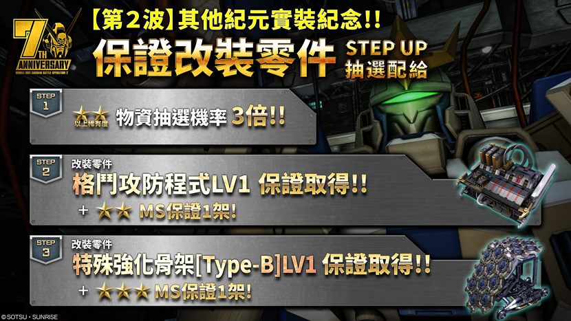- ・STEP3(代幣30枚):保證特贈改裝零件「特殊強化骨架[Type-B] LV1」!&保證★★★MS1架!