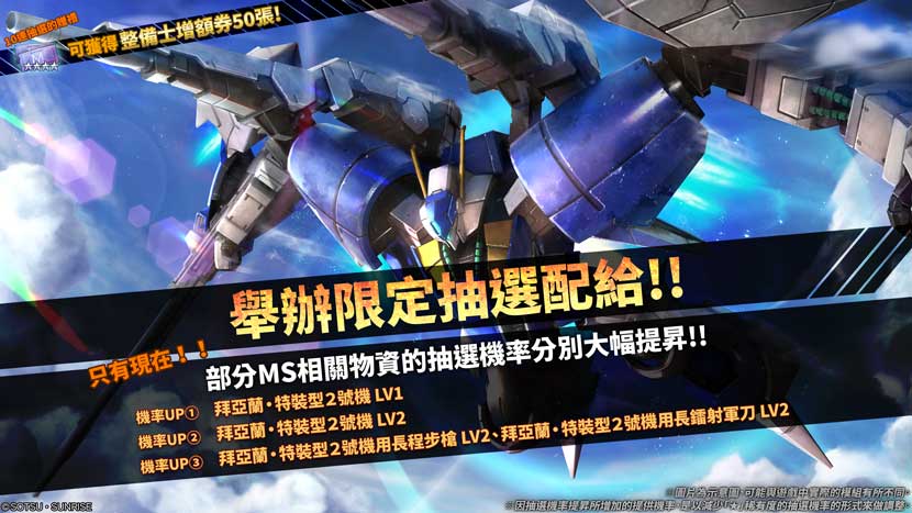 限定抽選配給中,將會提高「拜亞蘭・特裝型2號機」相關品項抽選機率。 - 此外,在本限定抽選配給進行10連抽,保證附贈「整備士增額券[★★★★]」50張。