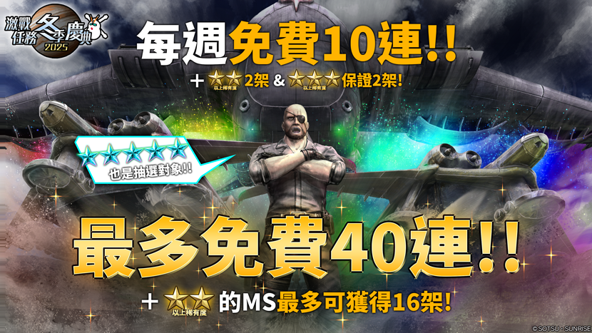 此外,每次10連抽★★以上MS保證獲得2架+★★★以上MS保證獲得2架 !