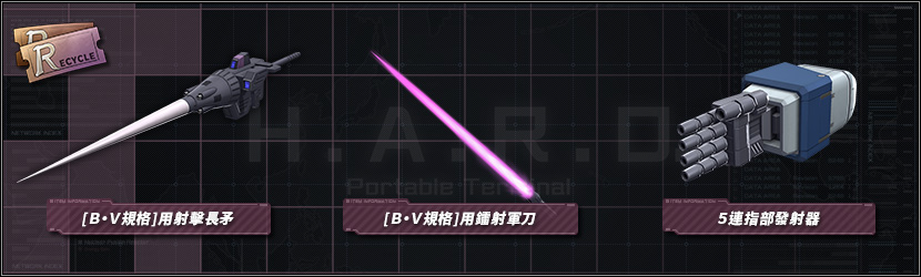 - ※「[B・V規格]用射擊長矛 LV2」及「[B・V規格]用鐳射軍刀 LV2」為先前已追加至回收窗口物資。