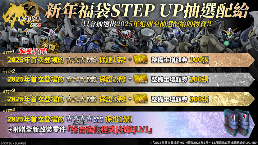 - 活動期間內,將舉辦保證獲得2025年內首度登場MS,再加上最終STEP附贈全新改裝零件的STEP UP抽選配給活動。