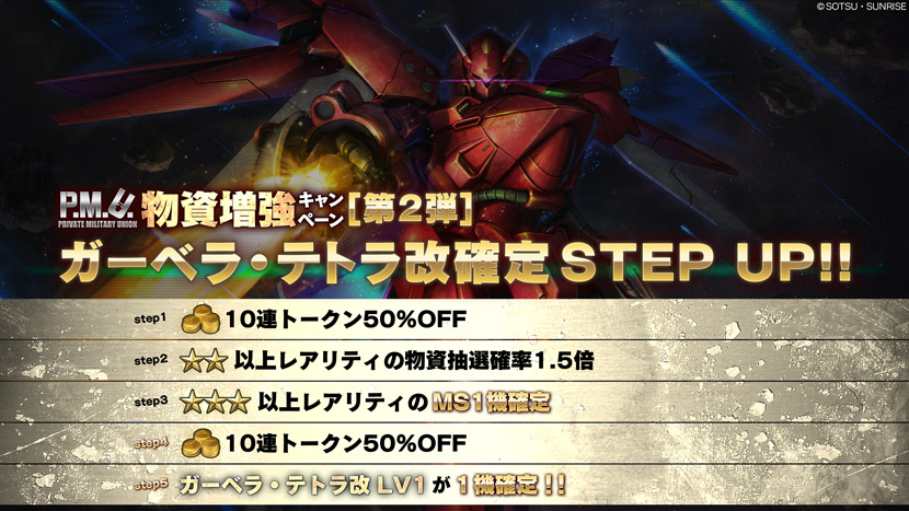 - ・STEP3(トークン30枚):★★★以上レアリティのMSが1機確定!