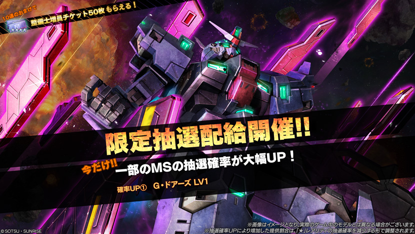 限定抽選配給では、「G・ドアーズ」の抽選確率がアップしております。 - さらに、本限定抽選配給では10連を要請するとおまけで必ず「整備士増員チケット[★★★★]」50枚がもらえます。