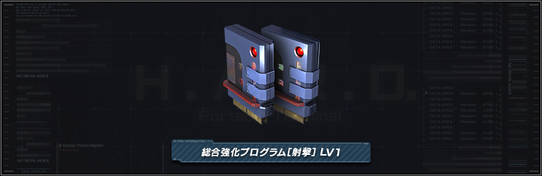 総合強化プログラム[射撃] LV1 機体HPが100増加し、耐実弾補正、耐ビーム補正、射撃補正が1増加する