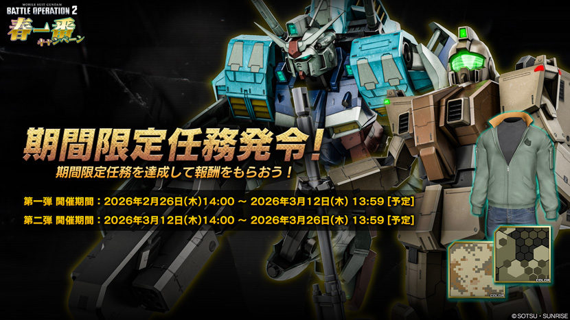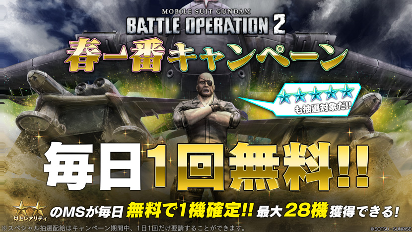 - 期間中、バトオペ2にログインするだけで「ZZガンダム LV3」や「バンシィ LV2」などのCOST750に出撃可能なMSと武器をセットでプレゼント!