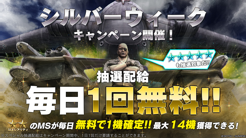 期間中、毎日1回無料で要請でき、★★以上レアリティのMSが確定する抽選配給となります。
