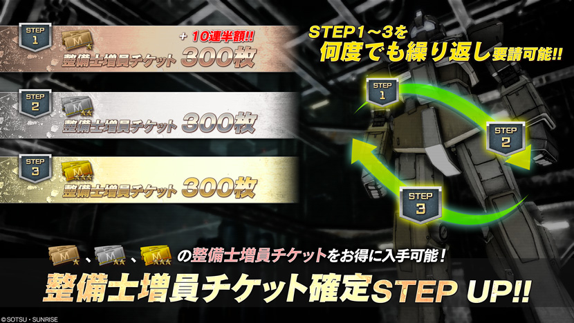 各STEPで整備士増員チケット[★]~[★★★]をお得に手に入れられるSTEP UP抽選配給となります。