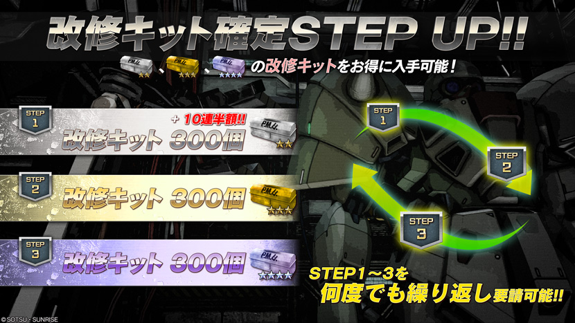 各STEPで改修キット[★★]~[★★★★]をお得に手に入れられるSTEP UP抽選配給となります。