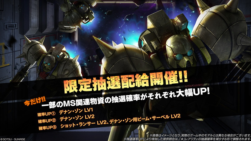 2025年9月25日(木)14:00 より、一部のモビルスーツ関連の抽選確率がアップする限定抽選配給を実施いたします。