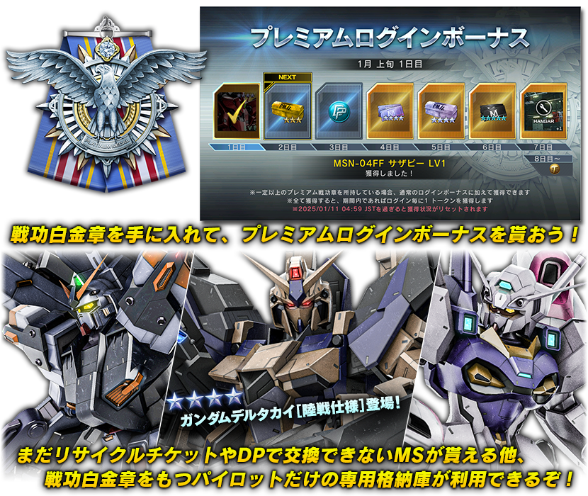 プレミアムログインボーナスは、『戦功白金章』を授与されたパイロットのみ受け取ることができます。 -