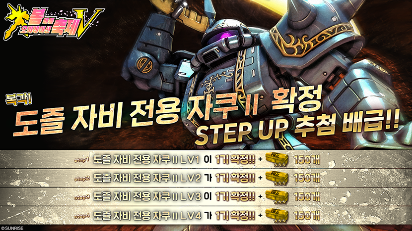 - ・STEP1(토큰 30개): 도즐 자비 전용 자쿠Ⅱ LV1이 1기 확정!+보너스로 개량 키트[★★★] 150개 포함!