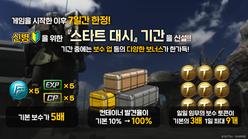 - ※스타트 대시는 배틀 오퍼레이션 2를 처음 실행하여 타이틀 화면의 「GAME START」를 선택한 이후 7일간이 대상입니다.