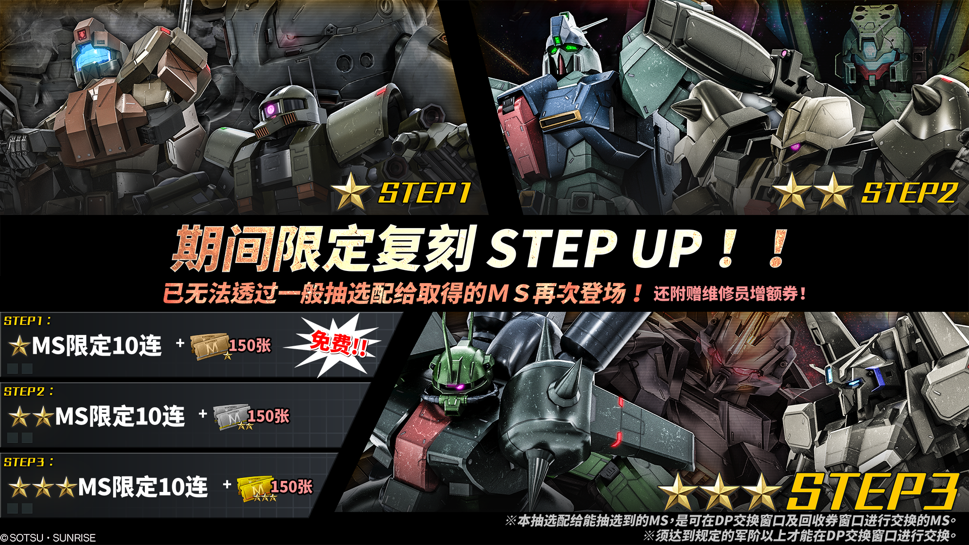 于DP交换窗口交换,有一定的军阶限制。 - ・STEP1(代币0枚):免费10连抽!保证物资皆为★MS&获得额外特赠整备士增额券[★]150张!