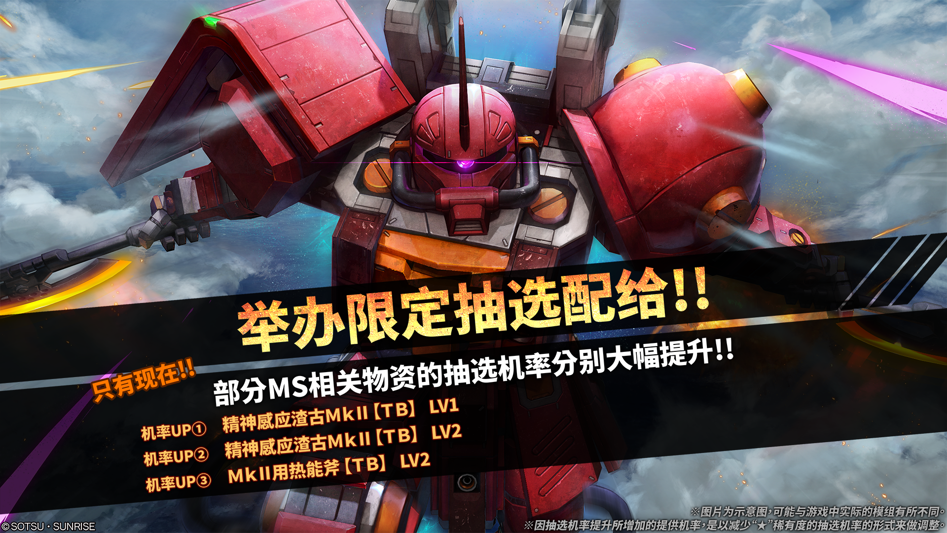 限定抽选配给中将会提高「精神感应渣古MkⅡ【TB】」相关品项抽选机率。 - ■抽中机率提升的物资