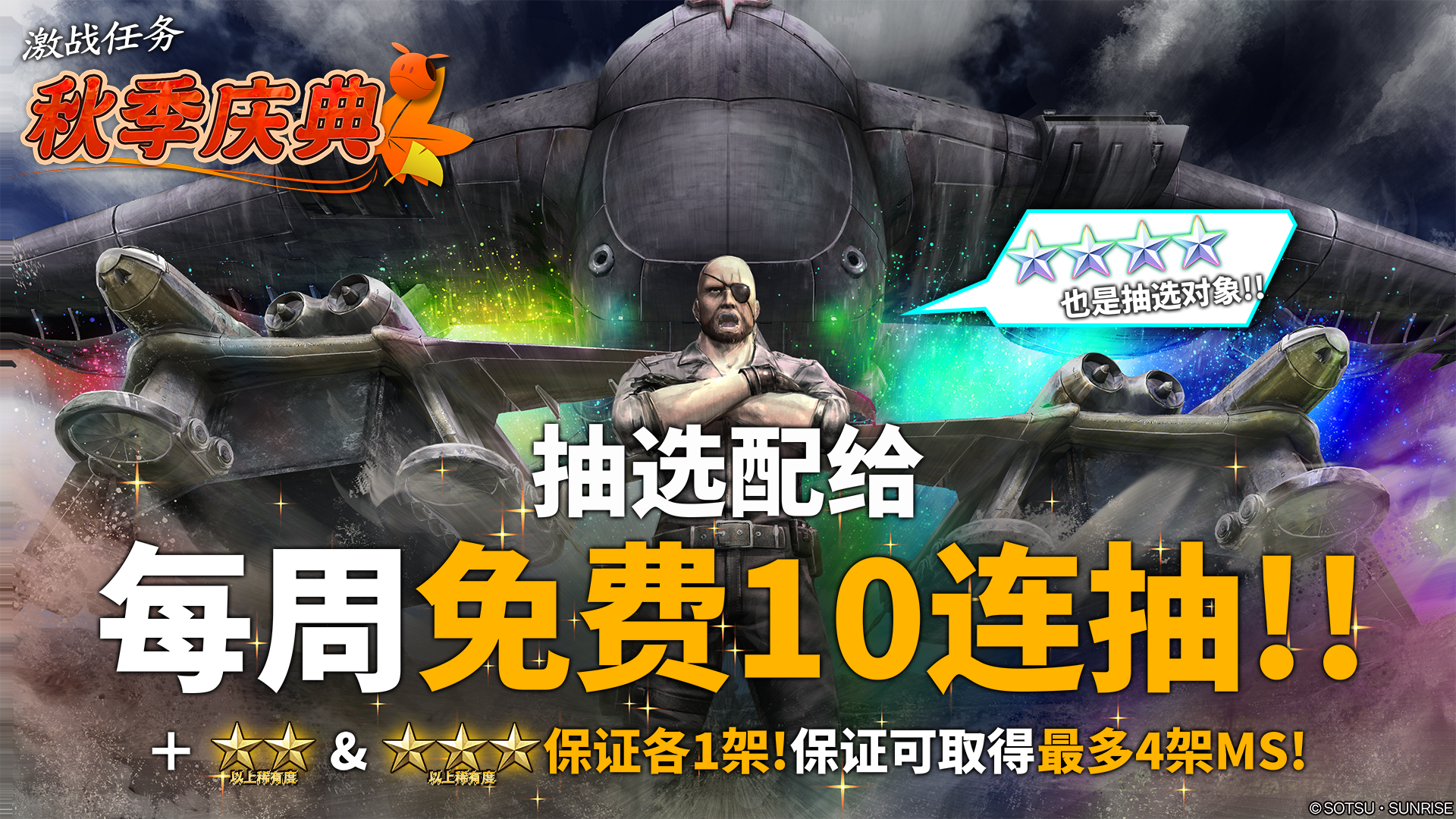 - 活动期间,每周可免费进行保证获得至今为止在抽选配给中登场过的MS&武装的特别抽选配给。