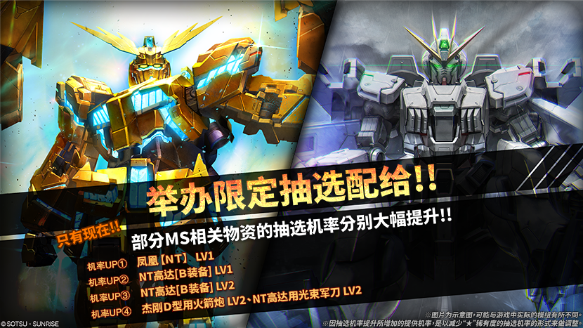 限定抽选配给中将会提高「凤凰【NT】」及「NT高达[B装备]」相关品项抽选机率。 - ■抽中机率提升的物资