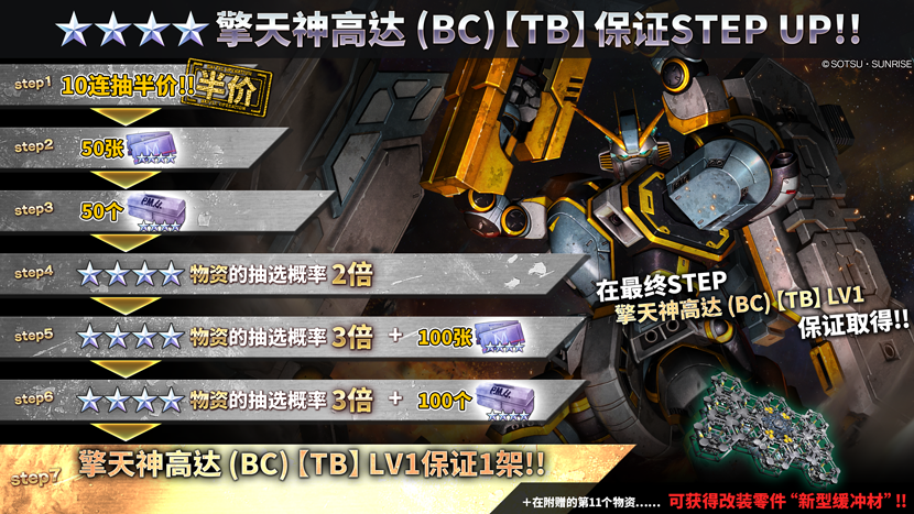 - 2024年5月30日(周四)起,举办保证获得擎天神高达(BC)【TB】 LV1的STEP UP抽选配给活动。