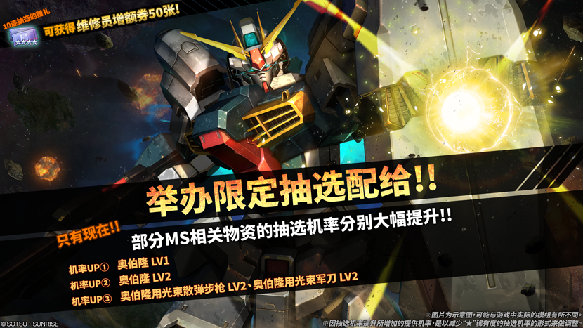 - 限定抽选配给将会针对目标机体各LV,主武装等提高各自的抽选机率。