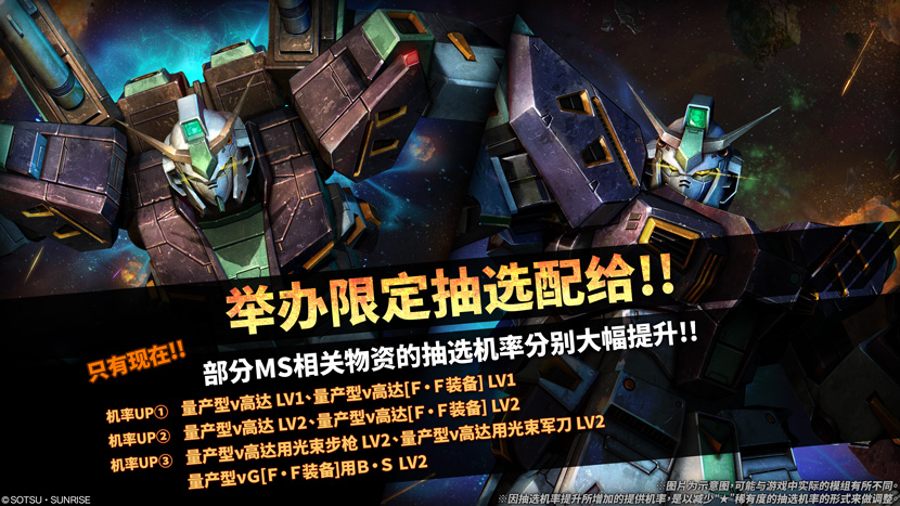 - 限定抽选配给将会针对目标机体各LV,主武装等提高各自的抽选机率。