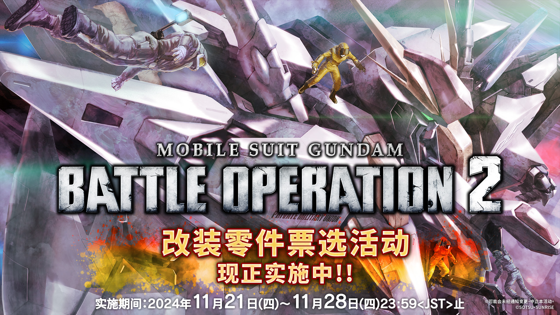 2024.11.21 改装零件票选活动 实施公告 ■2024/11/28 14:00 在活动期间内,可选择5个想要的改装零件! 按照想要的顺序选择并排名,即可完成票选活动。 此外,预定将于日后举办: 透过10连抽选补给,即可从票选排名较高的改装零件中,随机获得一个作为赠品的限定抽选配给活动。 参加票选请参阅:https://bo2.ggame.jp/sc/special/partsrequest ■票选期间 实施中 ~ 2024/11/28(周四) 23:59<JST> [预定]